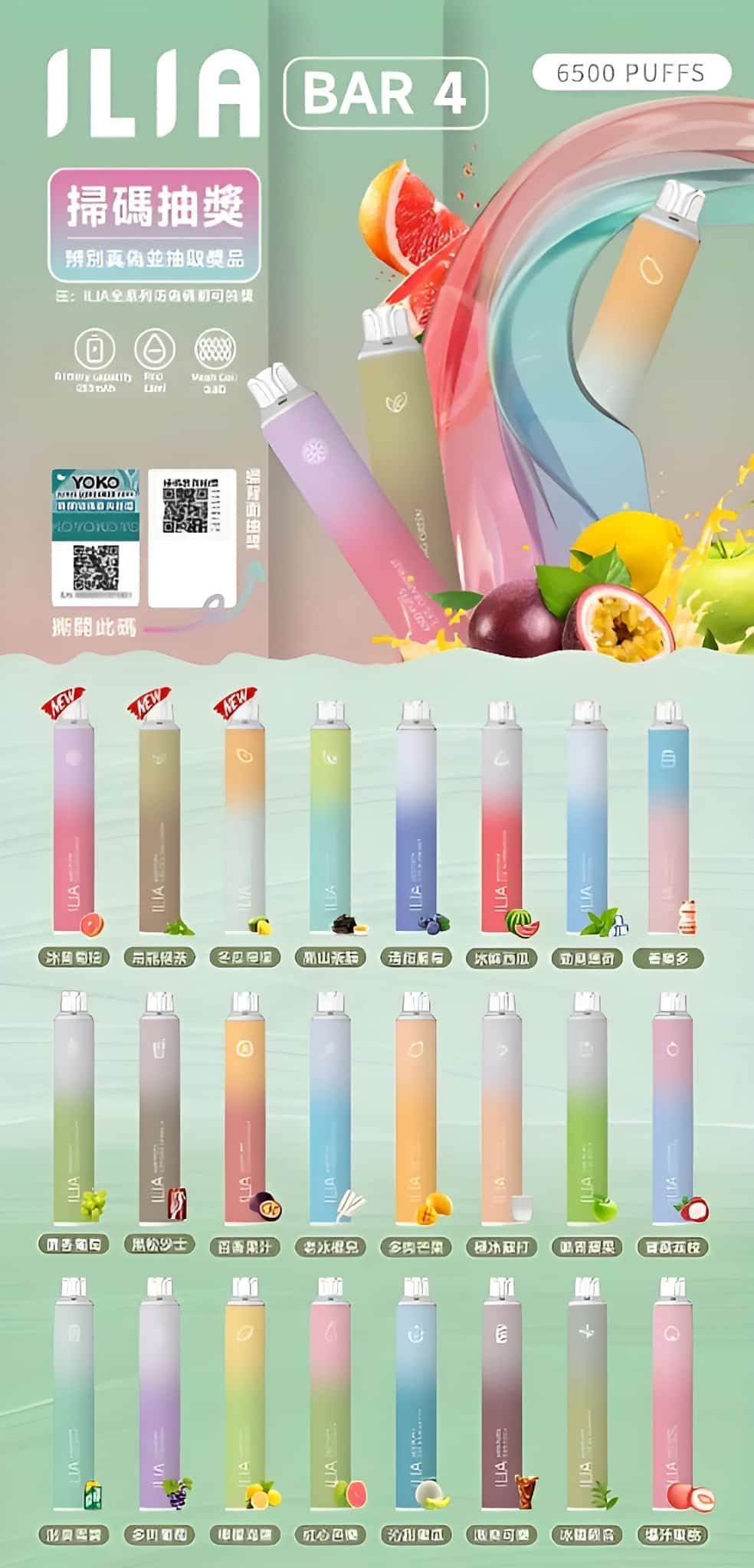 ILIA BAR4 6500口代拋棄式電子煙,不只是 6500 口的大容量,更結合發光設計、可充電、涼感煙油與穩定霧化,讓每一口都過癮。台灣現貨,支援711到付,立即體驗升級版的便捷與快感!
